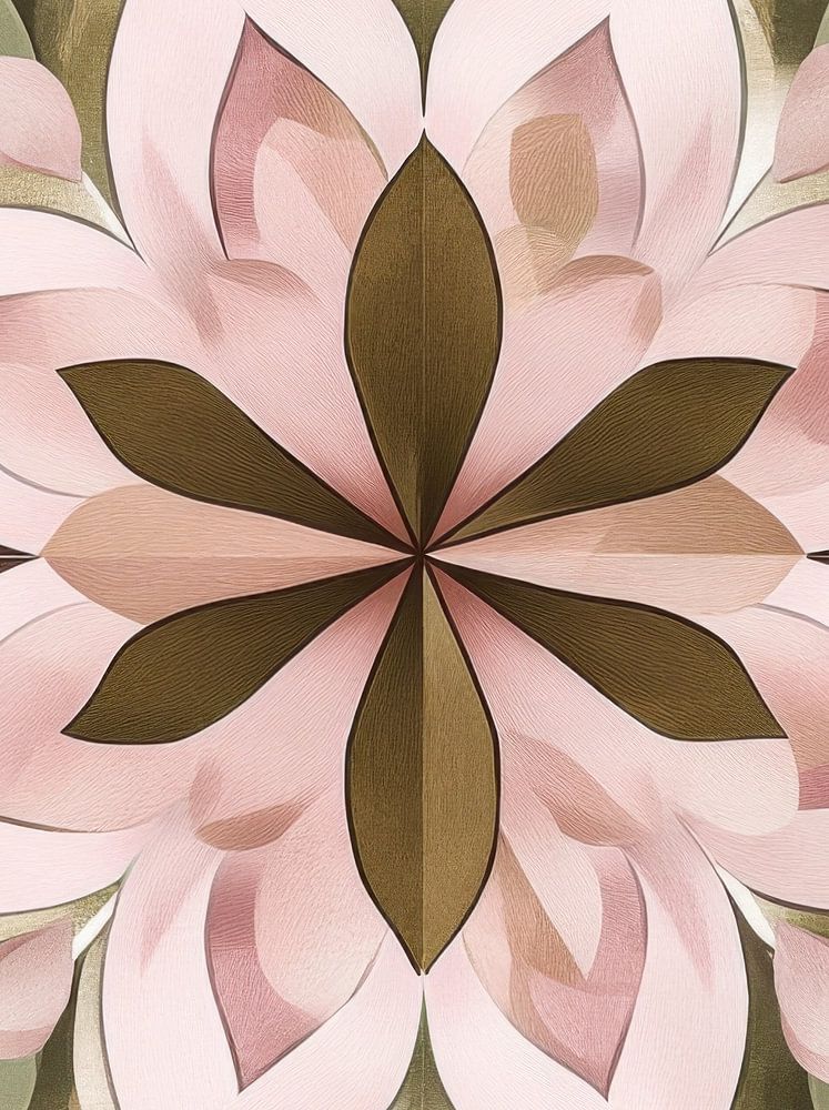 A seamless pattern featuring a digital illustration of flowers, whose petals form an intricate geometric circular design in dusty pink and olive green, with soft pink accents. The design combines Art Deco and Modern Luxury aesthetics, featuring muted plum tones with vintage brown accents and metallic elements for a sophisticated touch.
