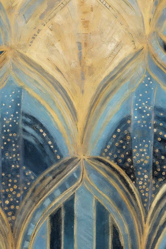 This work shows an abstract pattern of overlapping geometric shapes in soft shades of gold and blue. The repetition of shapes and refined details create a sense of harmony and balance. The subtle sheen of the gold against the rich blue background creates an elegant look. This composition is ideal for a modern interior where a touch of luxury is desired.