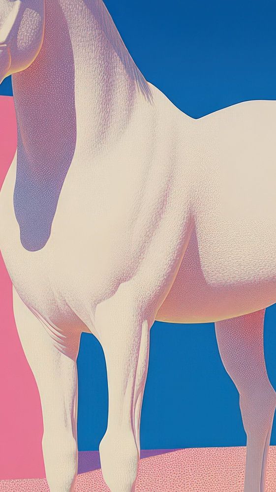 The background consists of tessellations with solid colours, creating a clean and graphic overall image. The sky is solid dark blue, creating a strong contrast with the light tones of the horse and the pink background. The colour palette consists of bright pink, deep blue, grass green, sunny yellow and ivory white, giving the scene a visual rhythm that is both calm and striking. The style is figurative minimalism with pop art influences, making the image recognisable but also abstract in its presentation. This work on the wall instantly gives a room a strong visual focal point. It exudes balance between nature and design, making it suitable for modern living spaces, creative offices or public spaces where visual impact is desired.