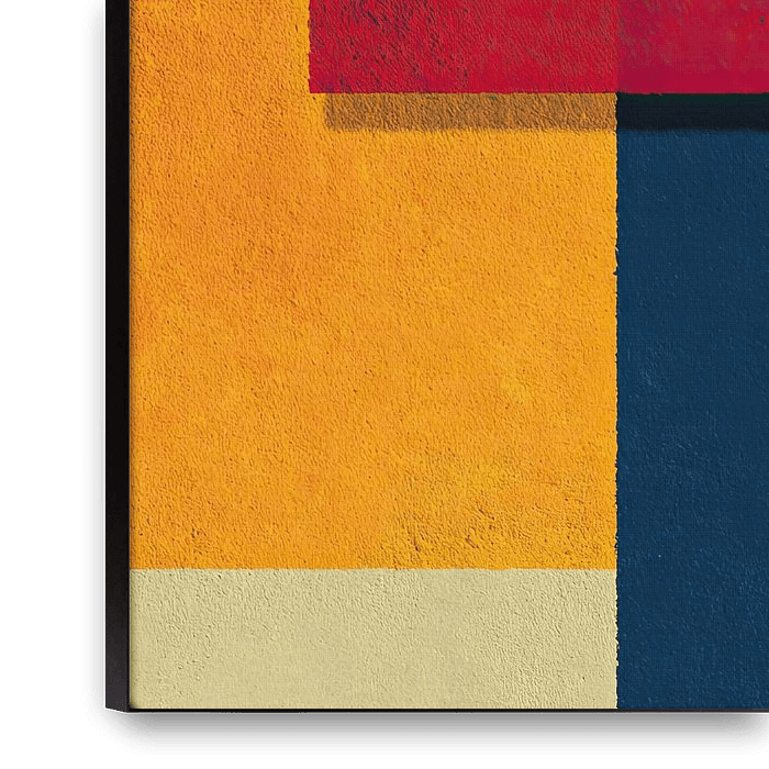 This abstract composition presents five precisely arranged rectangles in a balanced grid formation. The work plays with strong colour contrasts: a rich dark green meets a vibrant, grainy red, while bright yellow and deep dark blue form the foundation. The interplay of surfaces is particularly appealing – from granular, almost…
