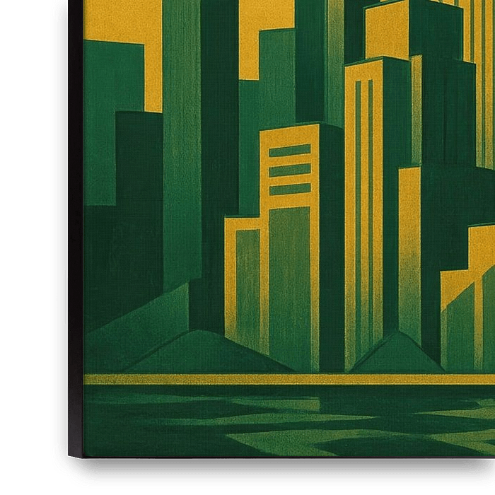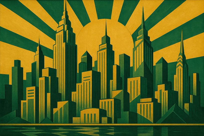 Geometric skyscrapers rise cascading in front of a big sun, while sleek rays run across the sky like a fan. The powerful two-tone combination of deep green and warm yellow creates a graphic contrast with a retro slant. Foreground reflections suggest water, adding depth to the clean lines and sharp angles. The rhythmic city profile and…
