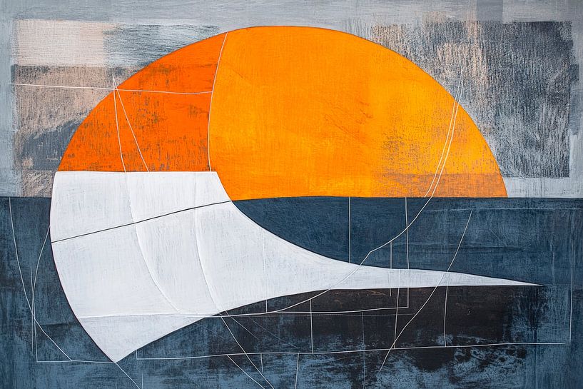 An abstract composition unfolds in warm orange tones and soft shades of grey, reminiscent of the play of light and shadow. The curved lines and clear shapes lend the work a certain dynamism and calm at the same time. Ideal for a modern living room, where it inspires conversation and creates harmony.