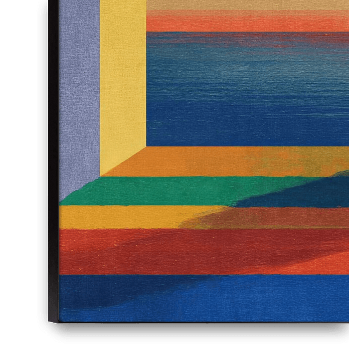 This abstract work presents two rectangular vistas framed by angular, faceted frames. Inside, complex colour gradients unfold: from cool deep blue and grey to bright orange and yellow tones. The lower section expands the spectrum with rich greens and reds, creating an almost prismatic effect. The fine-grained texture and precise dark…