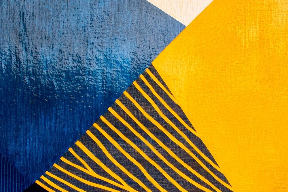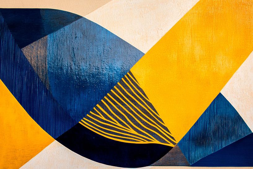 An interplay of dynamic shapes in deep blue and radiant yellow unfolds here, while elegant lines dance on warm colour tones. This harmonious composition brings energy and creativity to any room. Ideal for a modern office or a lively living room where inspiration and joie de vivre are celebrated.