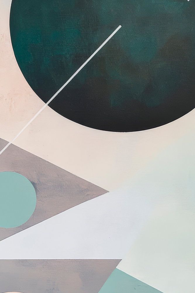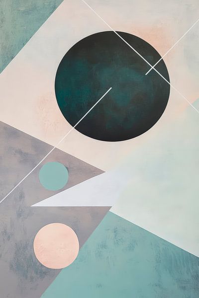 A fascinating interplay of geometric shapes and soft colours captivates the eye and mind. The large, dark circle and the small, pastel-coloured semi-circles create an exciting contrast. Ideal for a modern living room, this work of art adds a touch of elegance and contemporary flair to any room.