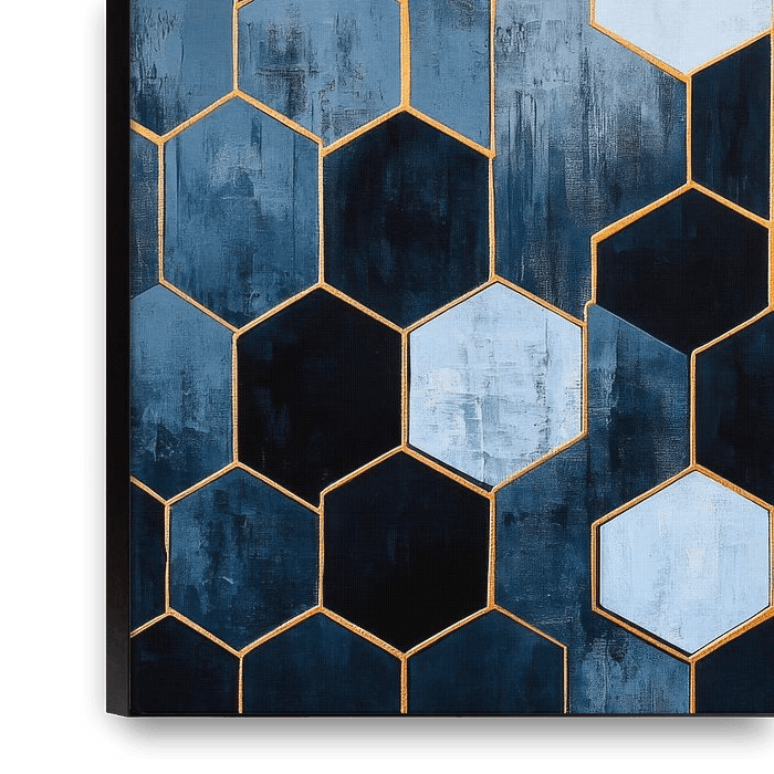 A fascinating interplay of geometric shapes unfolds in a symmetrical arrangement of hexagonal cells. The cool blue tones harmonise perfectly with a touch of radiant gold, lending the entire ensemble a modern elegance. This composition draws the viewer into a world in which structure and colour harmony merge.