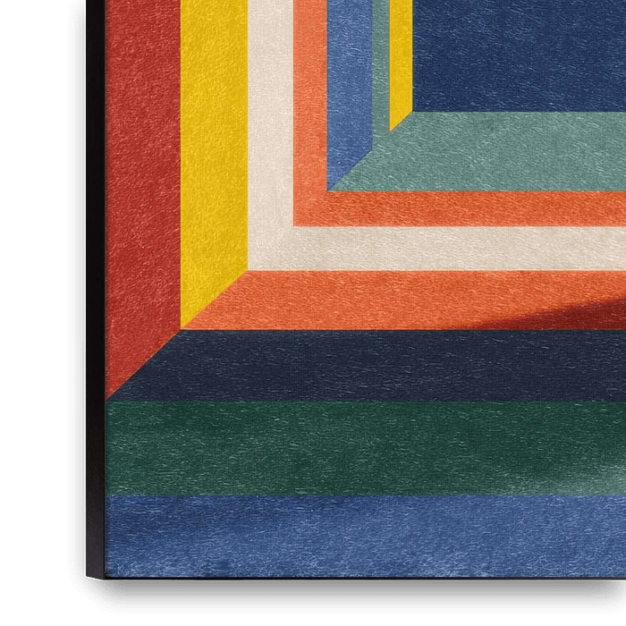 This abstract artwork depicts a series of concentric rectangles that create an optical depth effect. The colour palette includes bold red, orange, yellow, blue and dark green. A fine texture lends the graphic composition a tactile quality. The perspective arrangement draws the eye to a dark centre. Clear lines and geometric shapes…