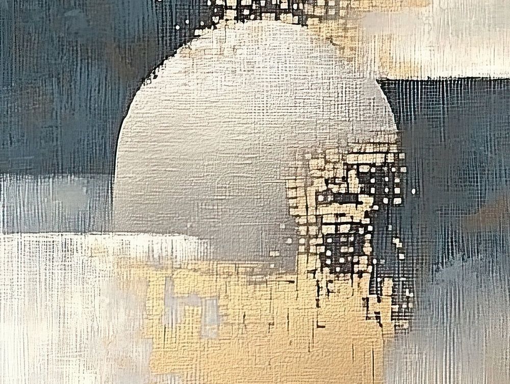 Geometric Shapes | Soft Textures, Digital Dawn - This abstract painting features a harmonious blend of geometric and organic shapes, centred around a large circular element, surrounded by pixelated and flowing textural contrasts in soft earth tones and blue-grey hues.