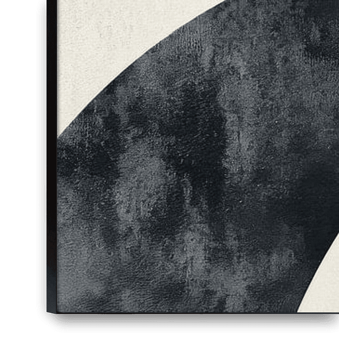 A harmonious interplay of circles and semi-circles unfolds, while the central black dot stands powerfully in focus. The soft grey tones of the background surface complement the design and lend it a mysterious depth. This symbiosis of shapes creates a calm, meditative atmosphere that encourages reflection and captivates the senses.