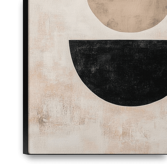 A harmonious interplay of geometry and colour unfolds in three powerful shapes: a radiant black circle at the top, followed by a soft, beige semicircle and finally a deep, shadowy semicircle. The earthy tones on the neutral background lend the composition a meditative calm and invite you to linger.