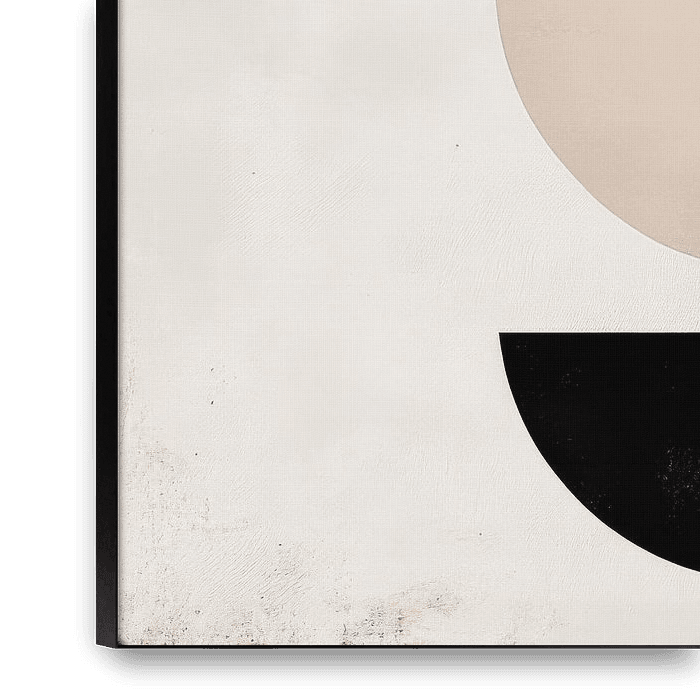 Three harmonious semi-circles in strong black and soft beige tones dance on the structured, light-coloured surface. Their clear geometry radiates calm and balance, while the interplay of light and shadow creates a subtle depth. This composition invites you to pause and reflect on shapes and contrasts.