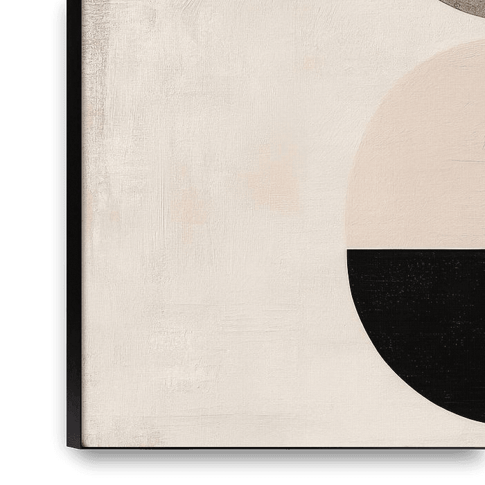 Three geometric shapes swim in a sea of soft, neutral tones. The contrast between matt black and delicate beige tones creates a harmonious tension. The altered perspective of the bisected circles leaves room for interpretation and invites you to linger, while the clear lines convey a sense of order and calm. An interplay of light and…