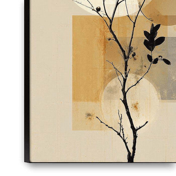 This refined artwork combines a delicate dried plant with large, floating circles and layered rectangles in warm, earthy tones. The composition balances organic beauty with geometric perfection, with gold and gray nuances embracing each other in a meditation on growth, transience, and inner peace. A modern visual poetry that weaves…