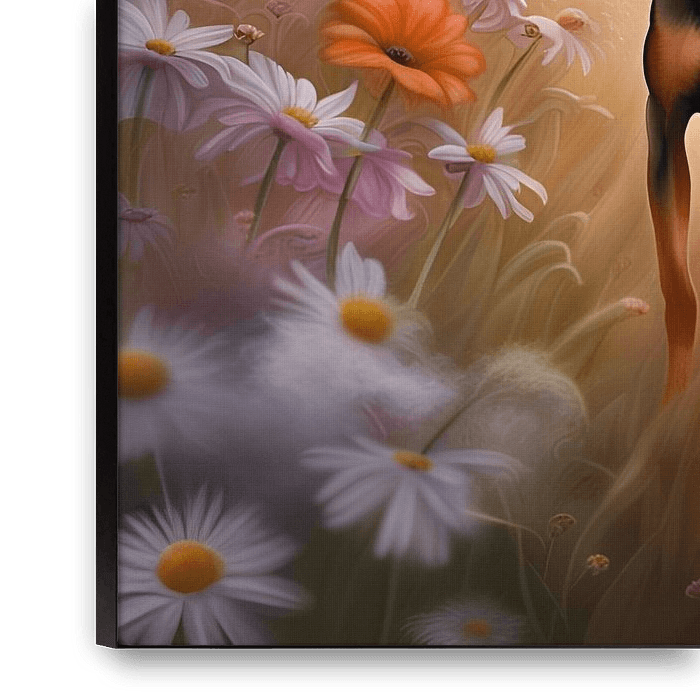 Buy this digital art artwork German Pinscher playing in a Flowerfield by Johannas Art Creations as a reproduction on canvas, ArtFrame, poster and wallpaper, printed on demand in high quality.