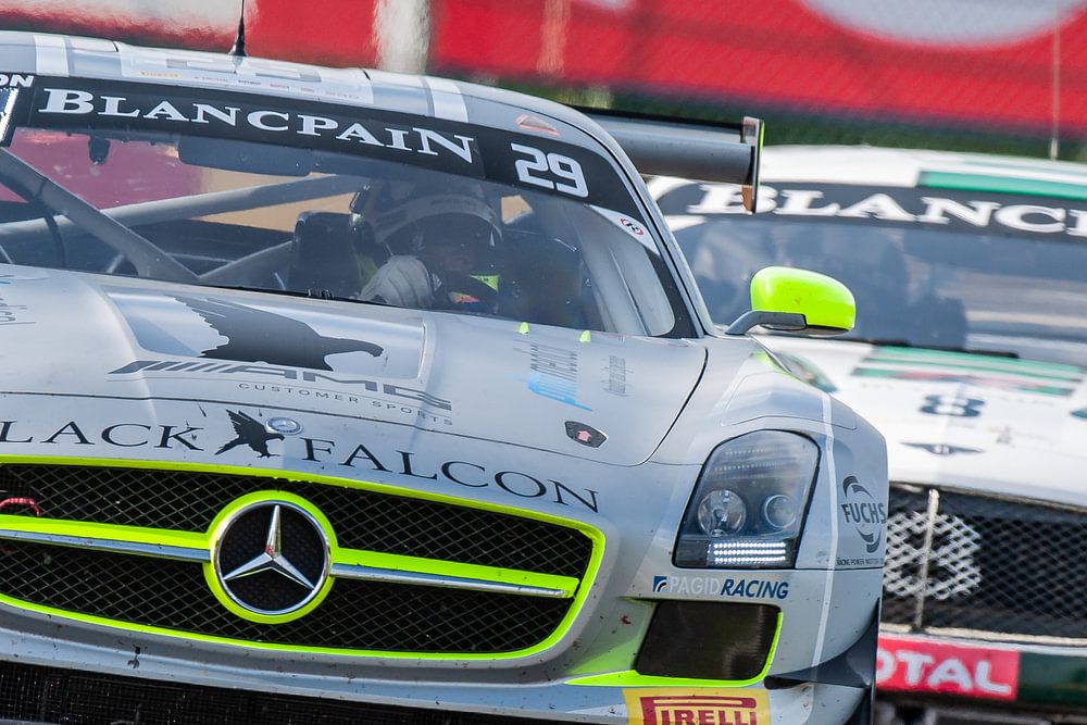 Mercedes-Benz SLS AMG GT3 versus Bentley Continental GT3 at Les Combes during the 2015 24 Hours of Spa. Blancpain Endurances Series, Circuit de Spa-Francorchamps, Belgium.