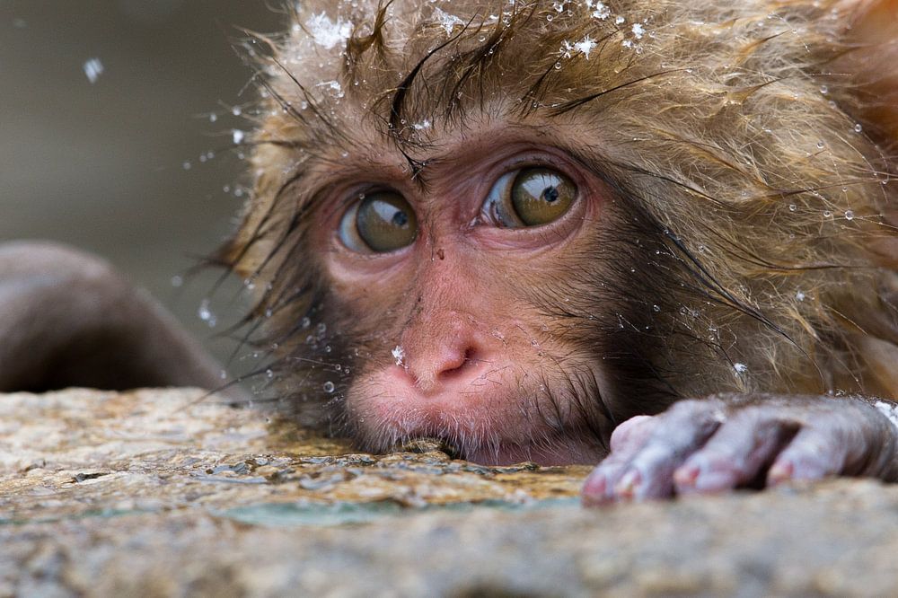 A cute young snow monkey is resting at the edge of the hot spring. The snow monkeys are quite competitive and therefore very active and alert. So it is sometimes nice and necessary to take a rest ;)