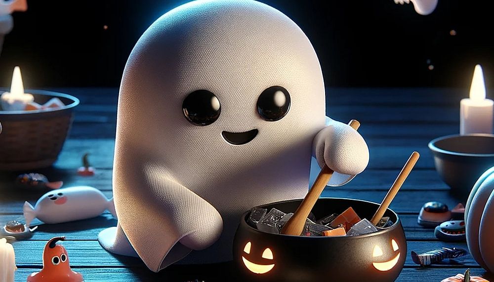 This delightful picture shows a small, smiling ghost who has embarked on a sweet Halloween adventure. The ghost is standing on an old wooden table, surrounded by a collection of Halloween treats and candles. He is stirring a black cauldron full of sweets, ready to savour the night's sweet treats. Spooky pumpkin lanterns glow in the background, echoing the flickering candlelight. Bats flutter under the glow of the large, bright full moon that illuminates the scene from outside through a window. The table is lavishly decorated with Halloween decorations such as small pumpkins, spooky candles and other sweets. The entire atmosphere is filled with the spirit of Halloween - a balance between the spooky and the charming, while the ghost lightens the mood with his innocent smile.