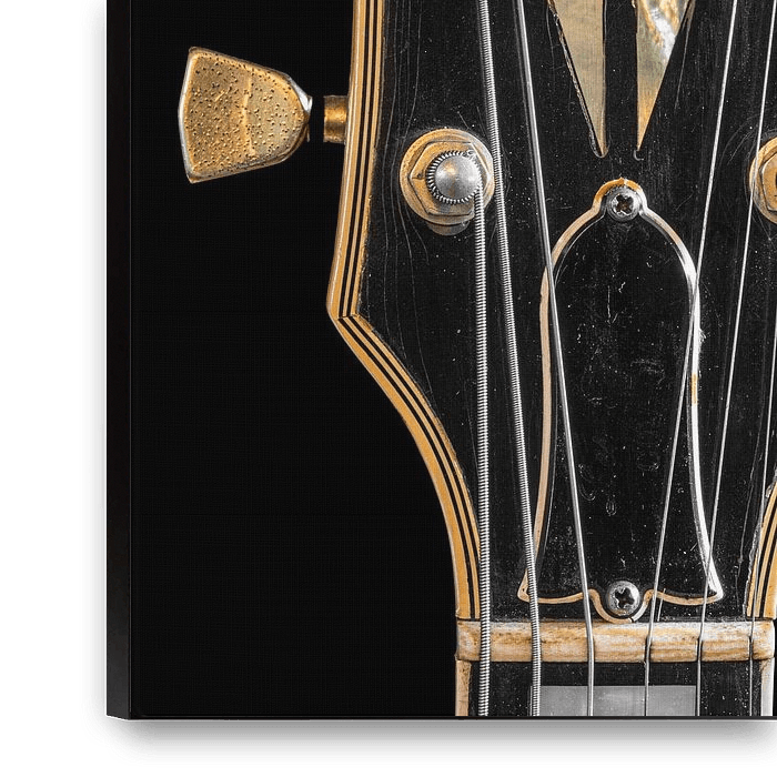 Close up photo of the iconic headstock of a 1974 Gibson Les Paul Custom. It has the famous Diamond inlay and Kluson Waffle Back tuners. You can see very well how time has left its mark on the metal and the craquelure in the finish.