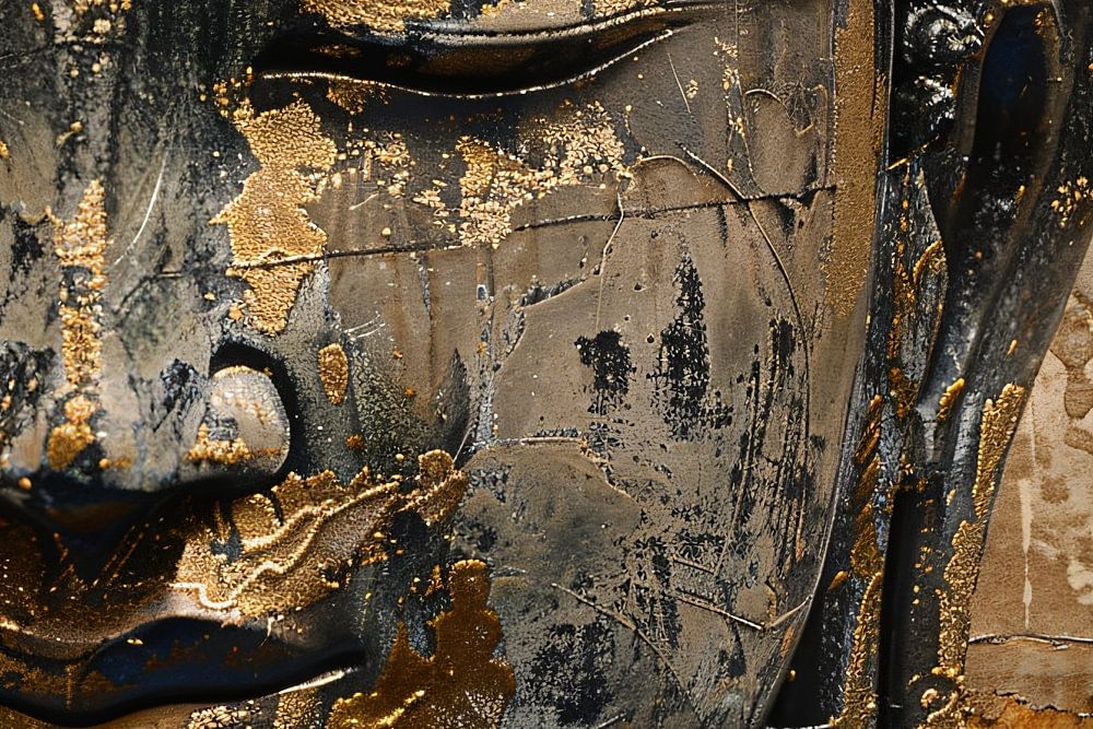 Discover the deep, soothing beauty of this unique design that blends the timeless look of the Buddha with modern, abstract art. The gold accents sparkle against the dark, weathered background, adding a dynamic and almost magical feel. Perfect for anyone looking to bring a bit of peace and contemplation to their space, without compromising on style and modern flair.