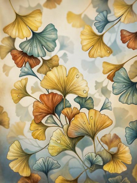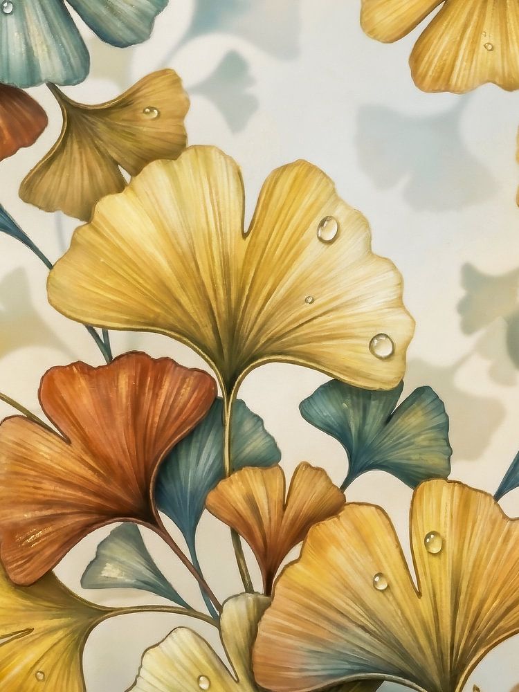 “Ginko – Botanical Elegance” appears like a silent dance of light, colour and natural form. The floating ginkgo leaves seem captured in a moment of perfect tranquillity – golden like late sunlight, petrol-coloured like a cool morning breeze, terracotta-warm like the memory of autumn. Small water droplets add subtle highlights and enhance the impression of freshness, delicacy and quiet movement.