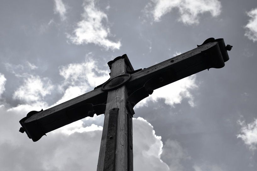 Das Gipfelkreuz von einer Bergtour letzten Sommer. Hier mit den Wolken in Hintergrund und in schwarz-weiß.