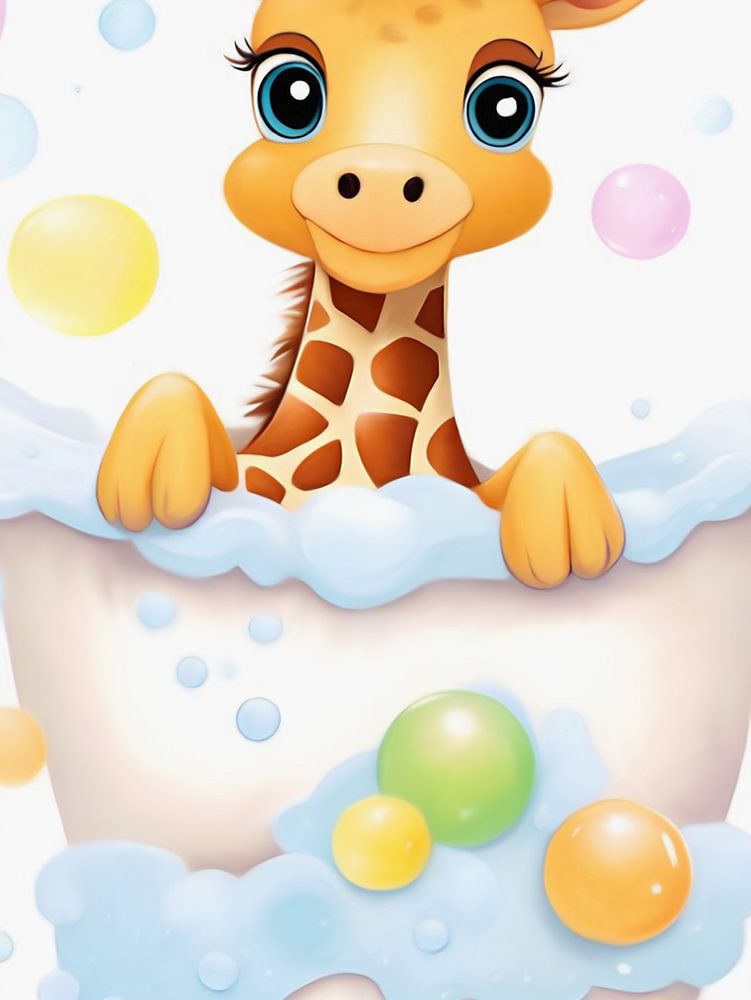 Bring cheer and gentle magic to the baby or nursery with this handmade Procreate artwork. A playful and happy little giraffe enjoys a bath full of foam surrounded by colourful soap bubbles in yellow, green, blue and pink. The soft pastel shades and cheerful composition make the scene charming, playful and dreamy.