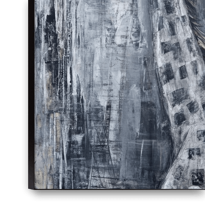 A majestic creature with an impressive, long neck rises up in powerful grey tones. The stylised spots tell stories from the savannah, while the contrast between light and shadow creates a mysterious atmosphere. A view into the distance, characterised by a calm elegance, invites you on a journey of discovery.