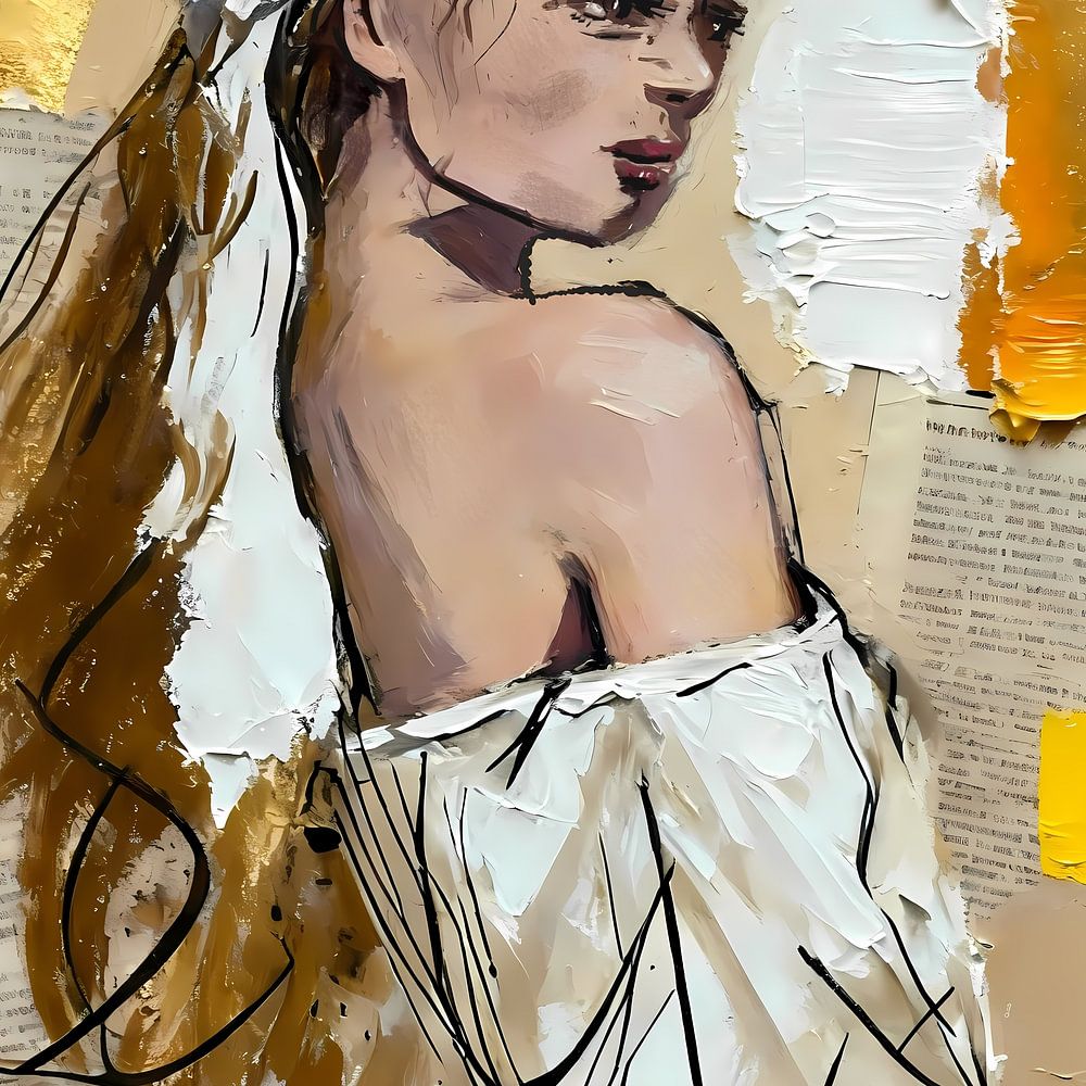 A girl wearing linen clothes on a mixed media background. Paper strips, newspapers, gold leaf, paint in yellow pink black and beige.