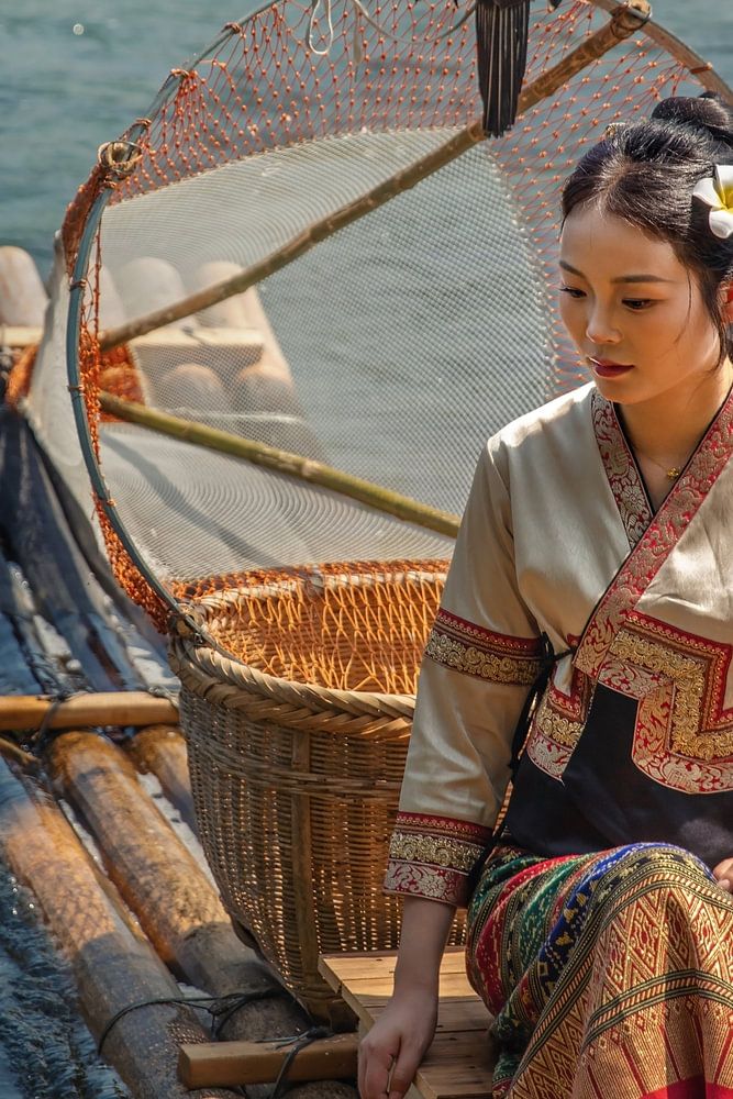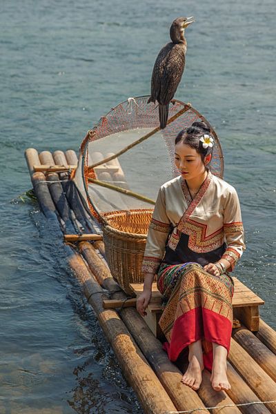 Chinese girl on a raft with cormorants on the Li River near Yangshuo. She is wearing one of China's many traditional costumes. In the morning, fishermen fish on the Li River with these boats.