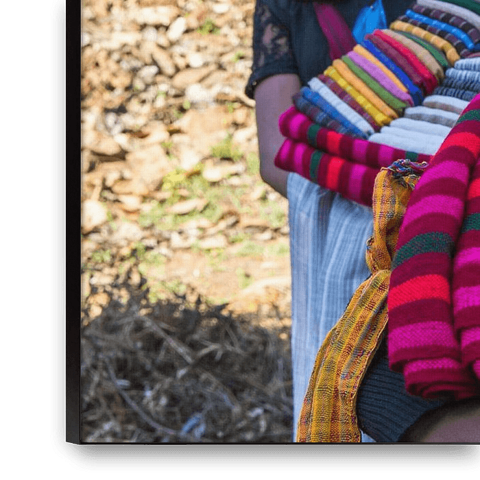 Buy this portrait Girl sells cotton scarves at the ruins of pagodas in Myanmar Inle. She Thanaka makeup on her face. by Wout Kok on canvas, ArtFrame, poster and wallpaper, printed on demand in high quality.