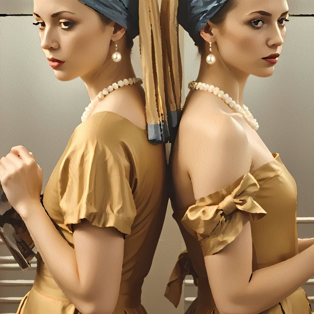 Two girls with the pearl, at a railway station. One with a can of soda and the other with a magazine. They are leaning against a column. In the background, a train races by.