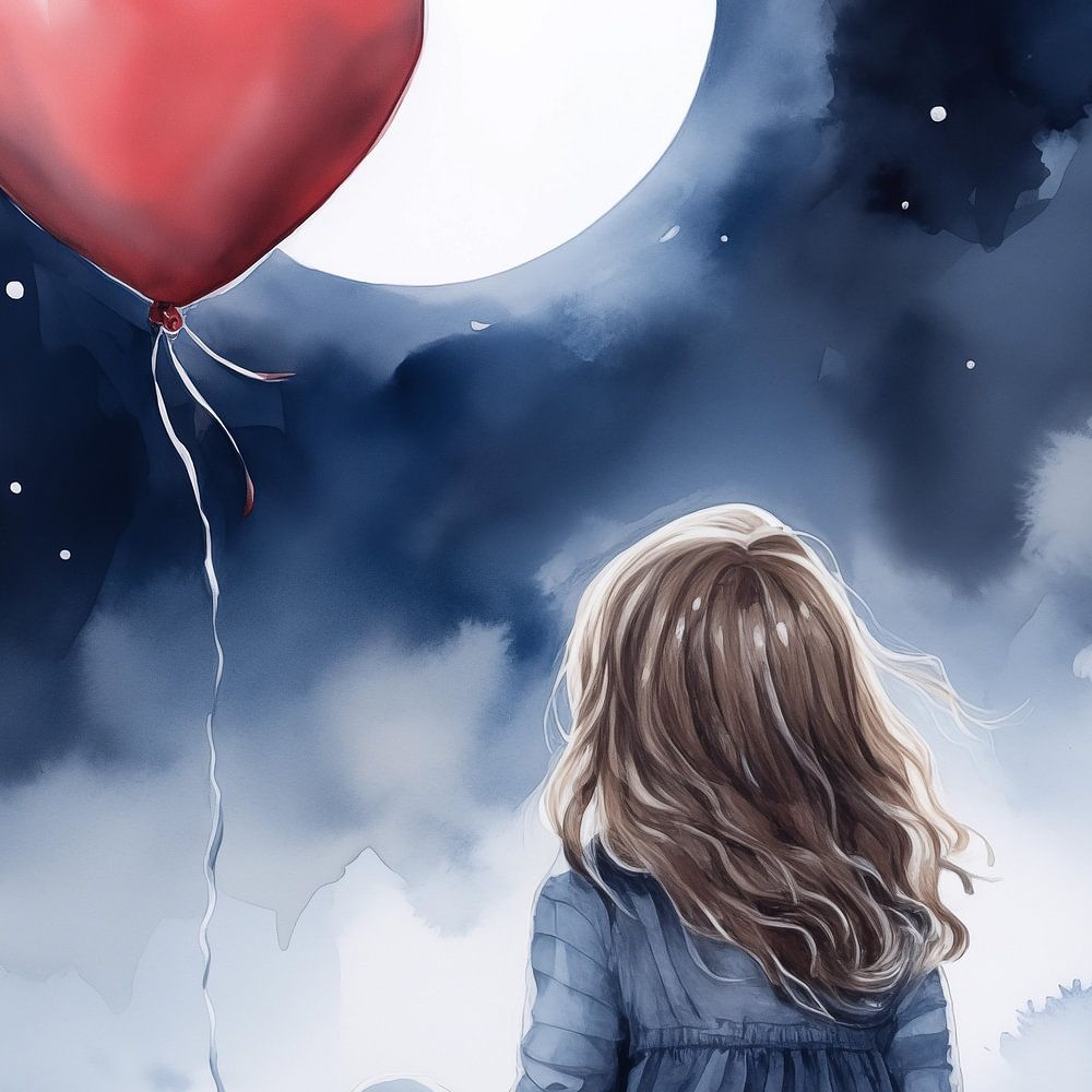 Girl with a red balloon in shades of blue, great for any nursery!