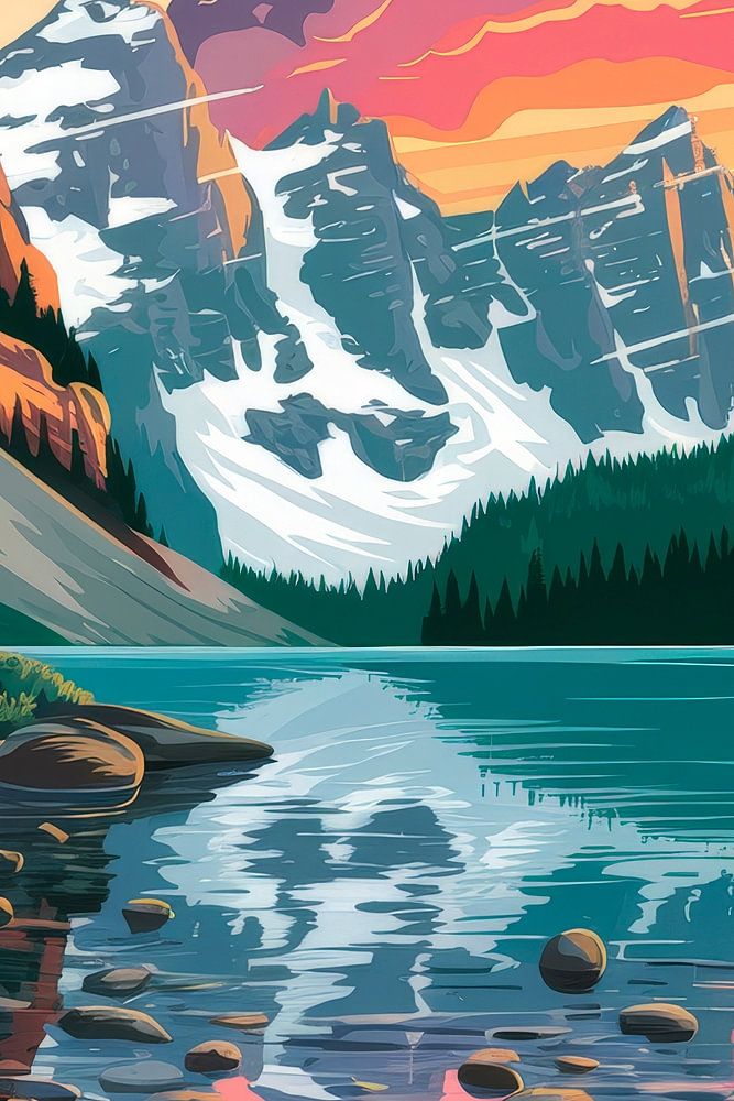 Majestic mountains and a reflective lake capture the breath of nature, while soft pastel colours embrace the sunset. This idyllic landscape exudes tranquillity and a sense of adventure - perfect for the living room, where it can stimulate conversation and create a relaxed atmosphere. A view that invites you to dream!