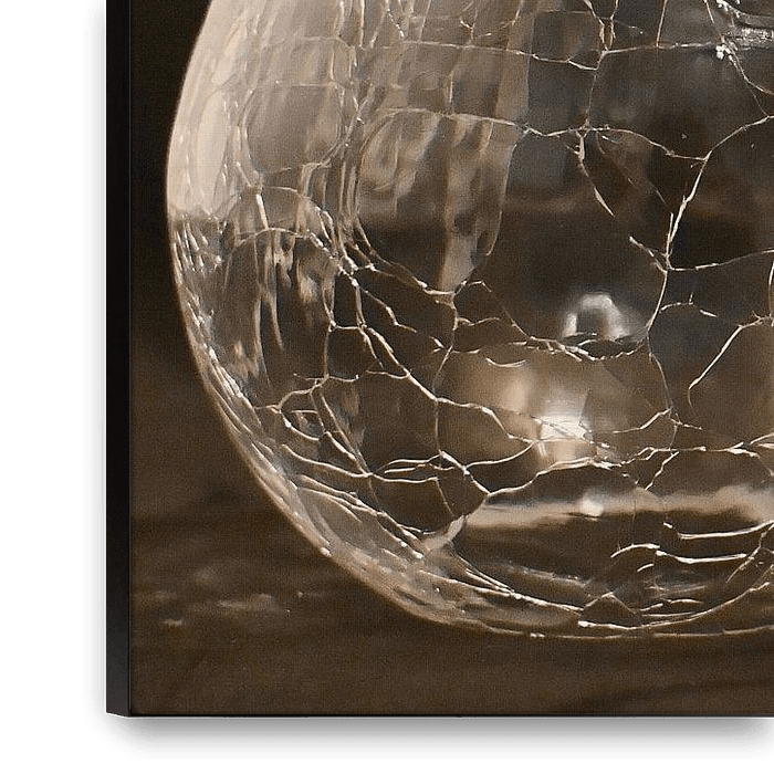 A understated and elegant composition of three glass objects, each with its own unique character. The subtle crackle patterns and air bubbles capture the light in a distinctive way, creating a play of reflection, depth and transparency. Against the dark background, the forms stand out powerfully, whilst the soft sheen creates a calm and…