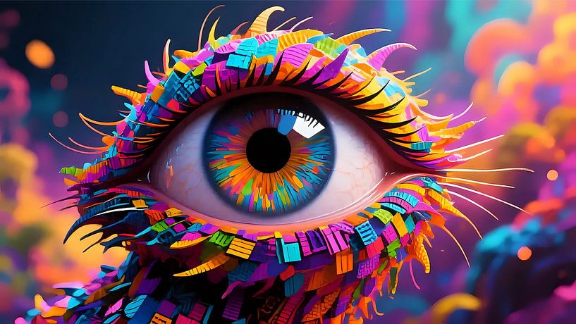 The painting shows a large-format eye as the central pictorial element, embedded in a magnificent field of radiant, bright colours and rich artistic textures, ideal as an expressive background image. The iris unfolds like a kaleidoscope: concentric rings of luminous cyan, magenta, saffron and emerald are structured by fine veins and…