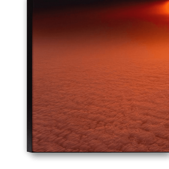 Ein dramatisches Spiel aus Licht und Farbe, aufgenommen hoch über der Erde. Eine dicke, bauschige Wolkendecke erstreckt sich bis zum Horizont und wird von unten in tiefes, warmes Orange getaucht, was ihr eine fast stoffliche Textur verleiht. Der leuchtend rote Sonnenball scheint in der Mitte zu explodieren und zeichnet eine scharfe, feurige Linie über der Nebelbank. Darüber steht ein dramatischer, dunkler Nacht- oder Dämmerungshimmel in Indigo und Schwarz.