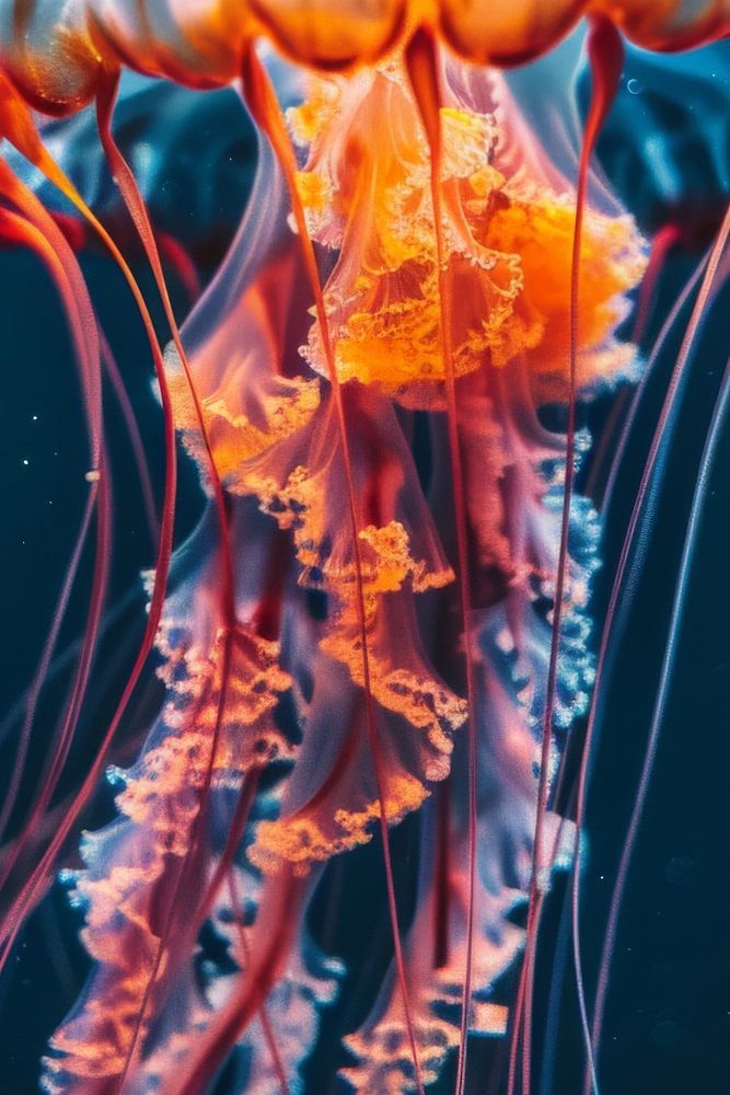 A breathtaking jellyfish floats in the depths of the ocean, its bright orange and translucent structure reflecting the light in a fascinating way. Its graceful tentacles dance gently in the water, while it is surrounded by a mystical, dark background that enhances the beauty of this mysterious creature.