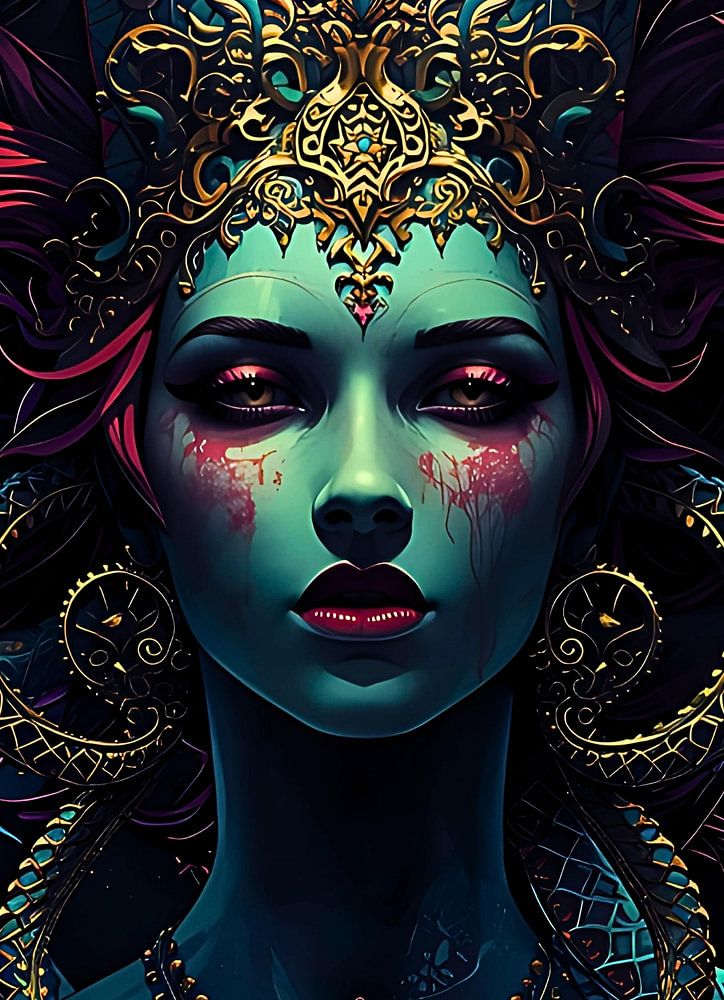 A digital art portrait features a goddess-like figure with teal skin and striking red makeup around her eyes. She wears an elaborate golden crown adorned with turquoise and has large, turquoise snake horns. Her hair is a vibrant mix of red and pink, flowing around her head. A golden necklace with intricate details graces her neck, and a snake-like form wraps around her shoulders.