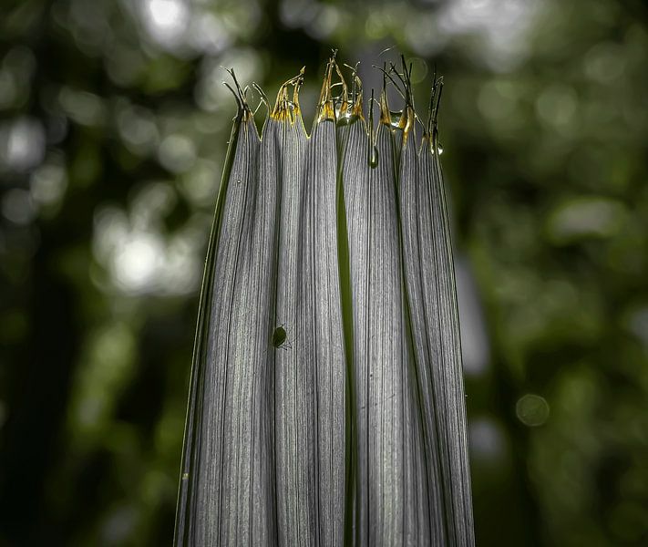 The gold of the morning sun frays from the leaf, from the Crocosmia Lucifer or Montbretia