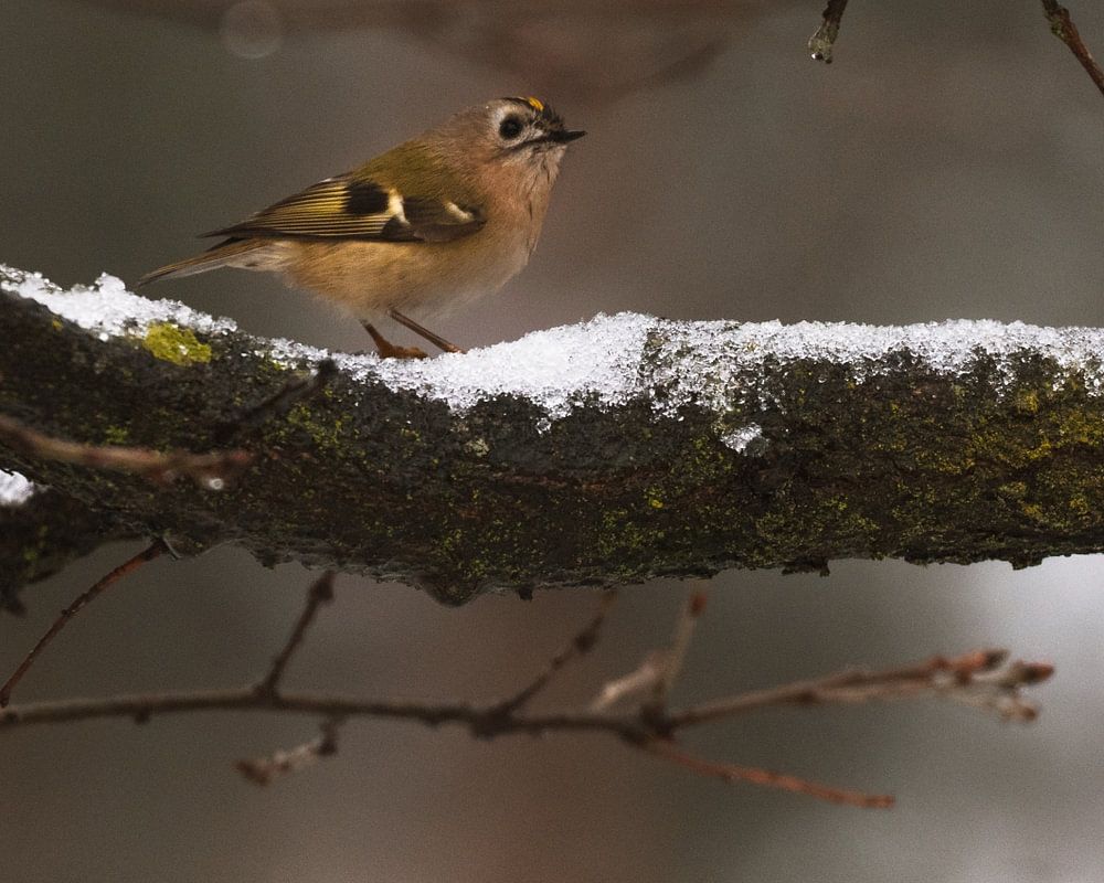 With its beautiful and prominent golden crest, this goldcrest moves through the snow-covered Veluwe forests along with a group of birds.