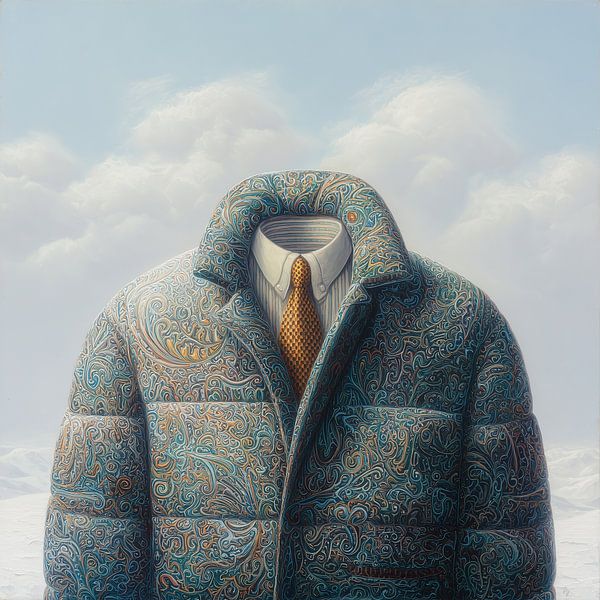 Als je dit puffer jas schilderij naar iemand zou willen omschrijven die het niet ziet, zou ik vertellen over die twee opvallende keuzes: de buitengewone, rijke textuur en het patroon van de jas, en de grappige formaliteit van een nette kraag met gouden stropdas, in een stille, winterse lucht. Het is eenkerstiggevoelzonderclichés—comfortabelmaarstijlvol,eenbeetjeabsurdenvindingrijk.Zoekjeeenjasschilderij,pufferjasschilderij,ofeensurrealistischwinterschilderijmetpatroonenstropdas,danvaltditwerkmeteenop:warmte,detailenlichteironiehandinhand.