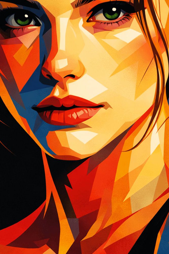 A bold geometric female portrait illuminated by dramatic golden light and deep shadows. The polygonal color layers create a contemporary pop art effect while the intense green eyes add emotional depth and sophistication. This artwork is perfect for buyers searching for modern portrait wall art with strong contrast and luxury…