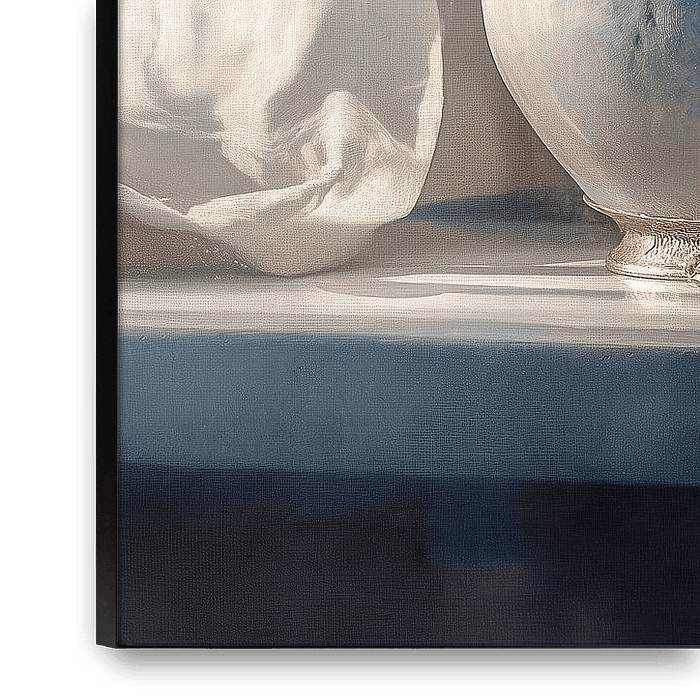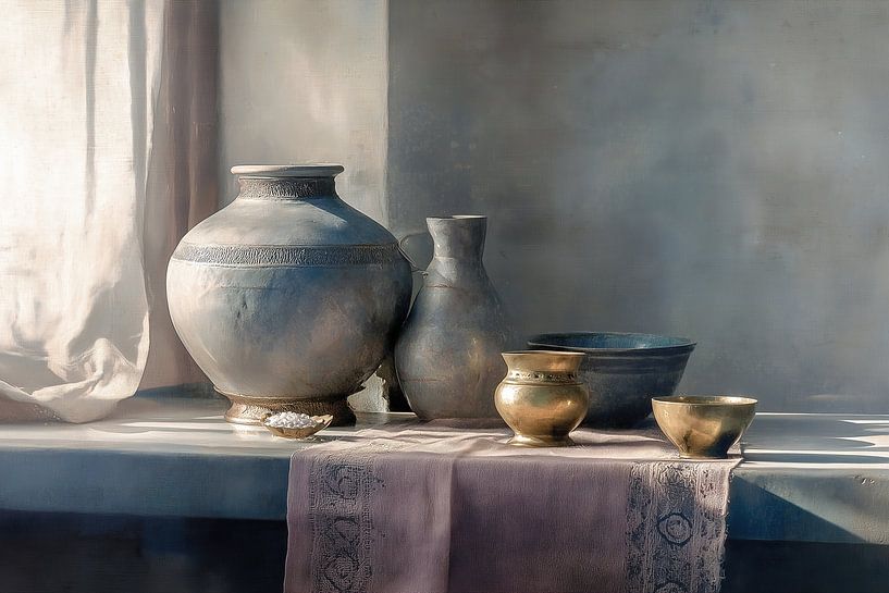 Golden Cup Harmony - This still life painting depicts a minimalist Japandi still life with a large round ceramic vase as the dominant centrepiece and shiny golden cups in front of it, softly lit by warm side lighting on a wrinkled linen cloth — still life painting, painting still life.