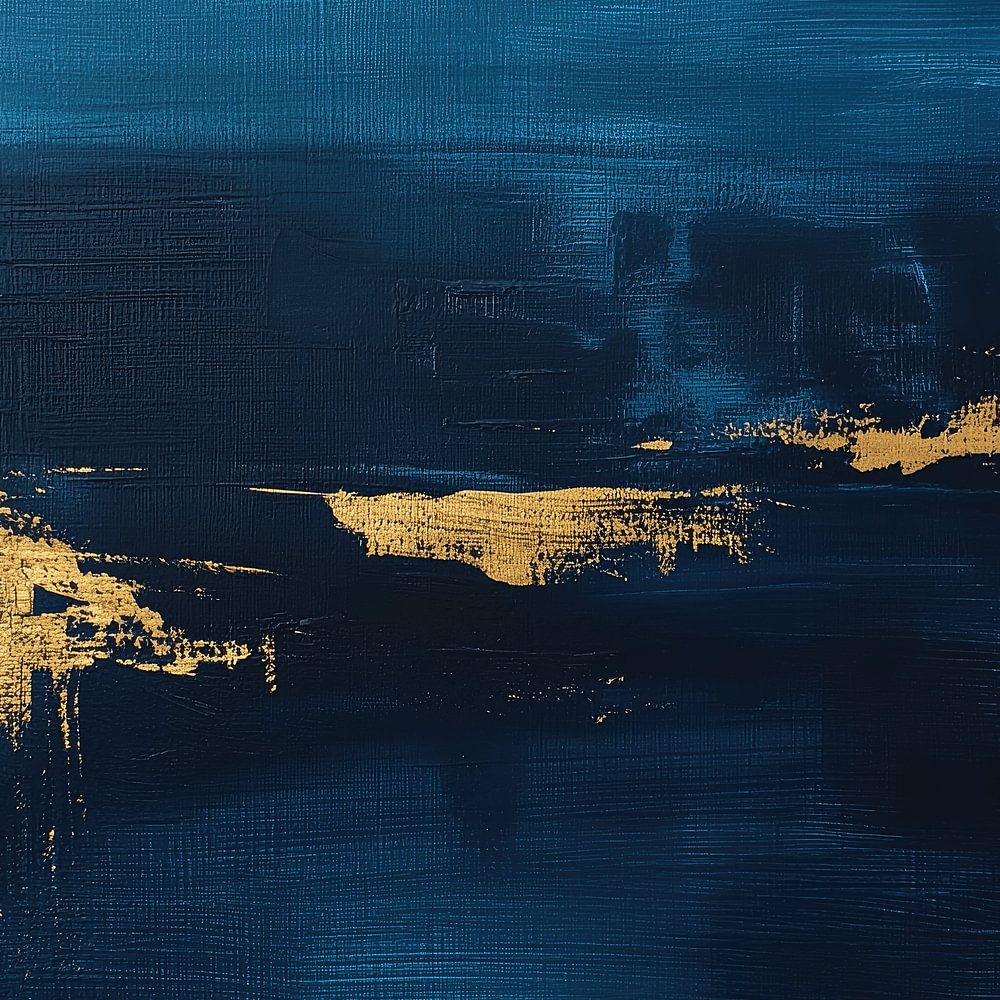 The flowing brushstrokes and subtle gradients of colour create a sense of depth and movement, as if the canvas is breathing and constantly unfolding. The golden textures reflect like distant shores, misty mountain peaks or reflections on a calm water surface. The balance between the dark blue and warm gold evokes a meditative atmosphere and invites the viewer to lose themselves in the abstract beauty of the moment.