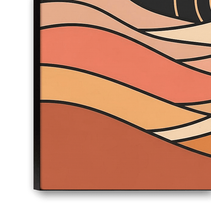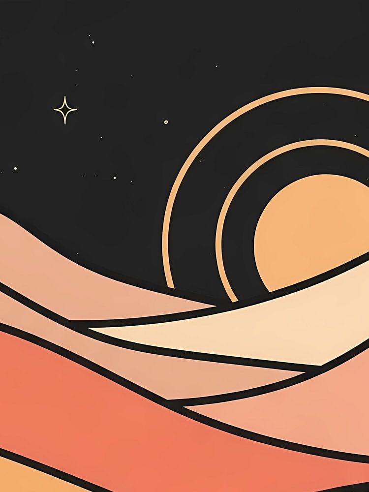This enchanting artwork invites you into a serene desert dreamscape under a mesmerizing sky. Stylized rolling dunes unfold in layers of warm, earthy hues – terracotta, sun-kissed peach, deep orange, and soft cream – each defined by crisp black outlines that lend a graphic, modern touch. Above, a velvety black sky holds a luminous golden crescent moon and twinkling stars, alongside a captivating celestial orb hinting at a rising or setting sun, adorned with elegant arcs. The inspiration for this piece seems rooted in the profound tranquility of vast desert nights, where the celestial ballet unfolds against a timeless landscape. It evokes a feeling of peaceful contemplation and warm serenity, a quiet moment where earth meets sky in perfect harmony. This artwork carries a deeper meaning of balance and the subtle magic found in natural cycles, a gentle reminder of nature's enduring beauty. Its clean lines and thoughtful color palette bring a bohemian yet sophisticated charm, making it a perfect addition to interiors seeking a calm, dreamy focal point. It speaks to those who cherish minimalist aesthetics, cosmic wonders, and the comforting embrace of earthy tones.