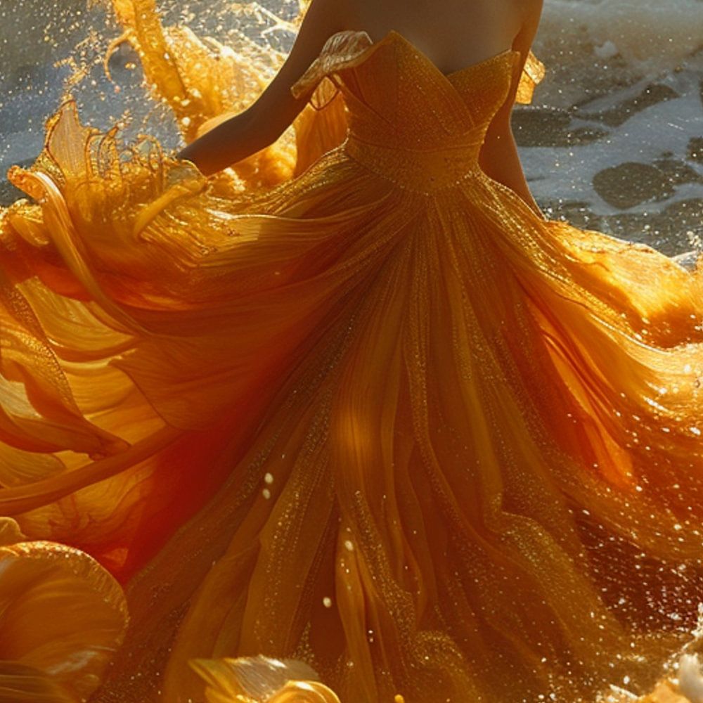 Enter the world of "Golden Embrace of the Ocean", a work illustrating the powerful synergy between man and nature. A creation that stimulates the senses, this work shows a woman surrounded by the waves of the ocean, enveloped in a golden dress that spreads around her like an aura of light.