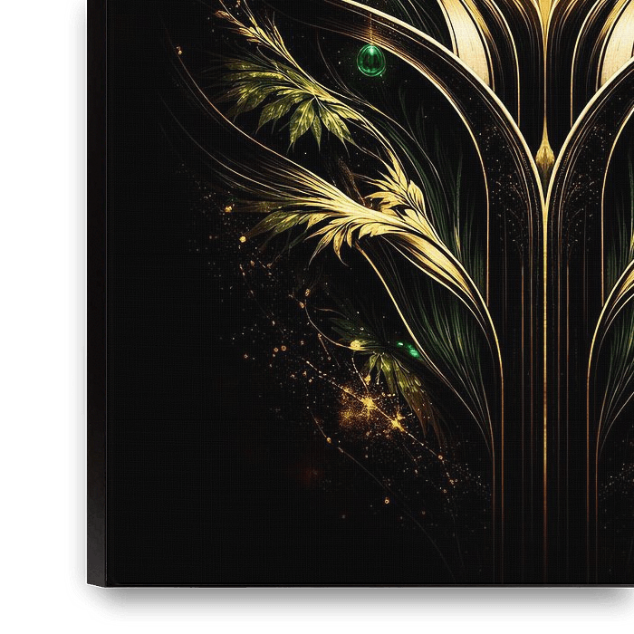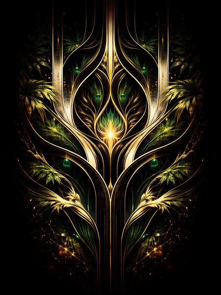 Experience the height of elegance with this intricate symmetrical digital masterpiece. The artwork features flowing golden filigree and ornate patterns that rise upward like a celestial flame, set against a deep black background for maximum contrast. Sparkling emerald green gems are delicately placed throughout the composition, adding a…