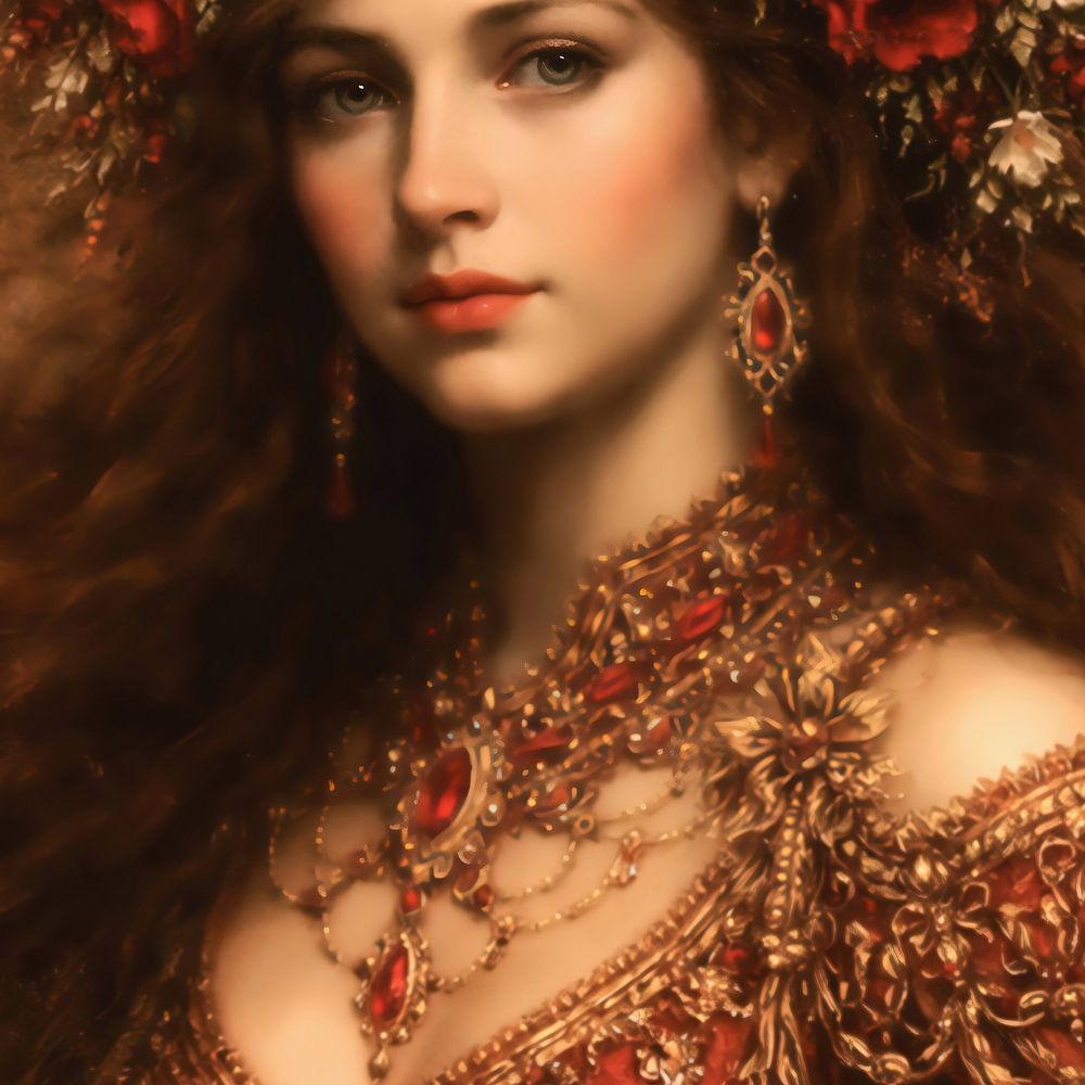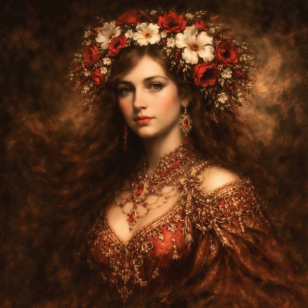 Golden Etherea is a portrait that blurs the line between classical Renaissance and contemporary fantasy. The work presents a young woman as a timeless icon, enveloped in an aura of warm light and regal details. The painting is dominated by a rich palette of burnt sienna, deep red and an abundance of gold leaf accents. Her clothing and…