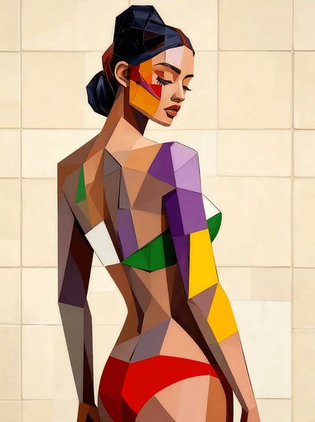 Her faceted silhouette shines in terracotta tones with bold purple, green, yellow, and red polygons against a serene tiled backdrop. Sharp angles fuse sensuality and strength, stirring mystery and modern poise.