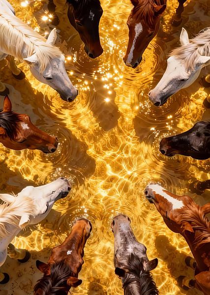 A circle of horses in white, bay, and black dips their heads to drink from a rippling golden pool, sunlight sparkling across the water's surface. Viewed from above, the serene gathering captures nature's quiet harmony in warm, ethereal light.